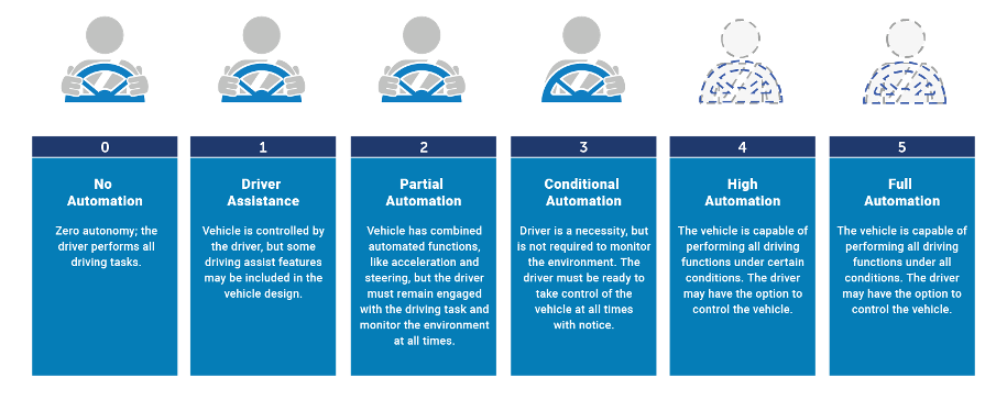Here we can better define the main stream notion of self driving cars as Level-5 automation according to the J3016 standard. However the industry is currently between level's 3 and 4.