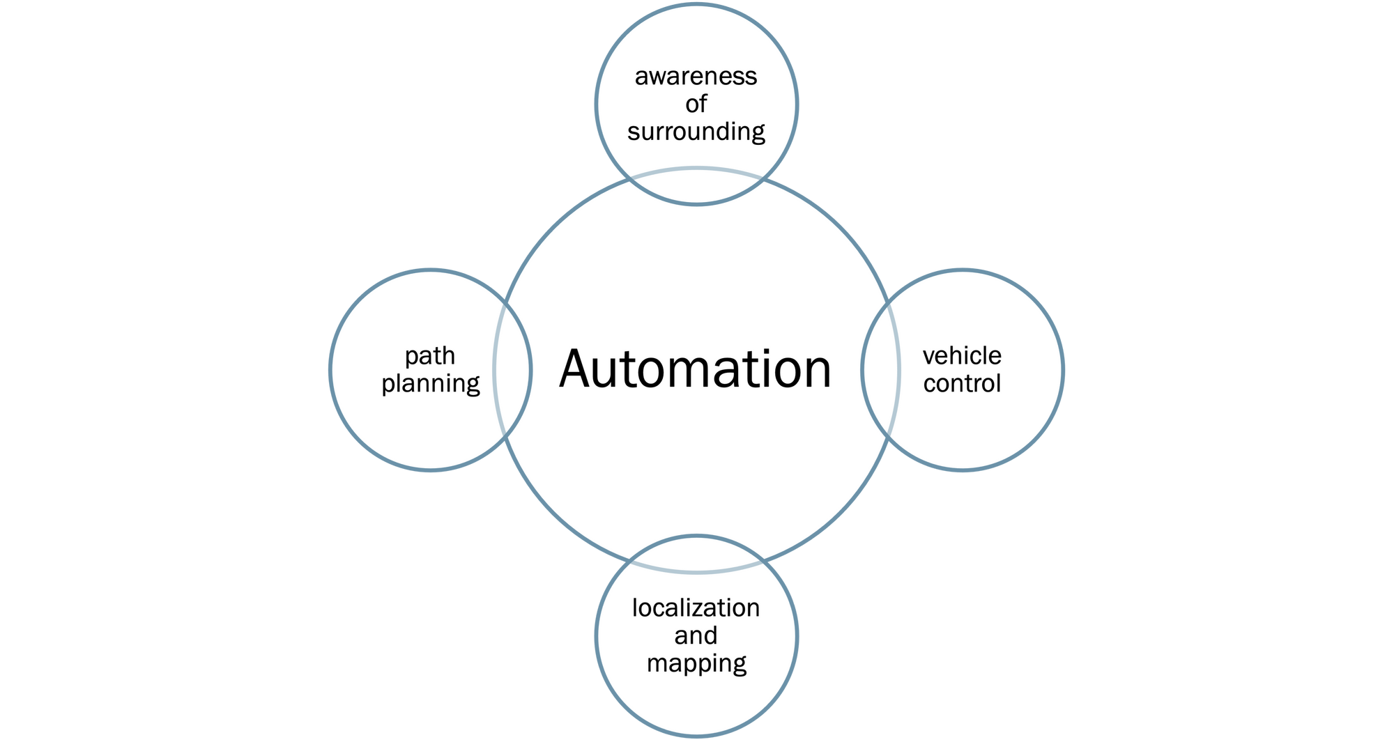 Automation in a vehicle context, can be broken down into 4 components: Awareness of surrounding, vehicle control, localization and mapping, and path planning.