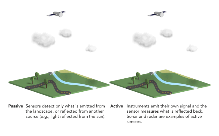 Passive sensors (like visible spectrum cameras or infrared cameras) are sensors that do not interact with the environment, i.e., they just wait to receive some input from the surrounding. In that context, our eyes can be categorized as passive sensors along with cameras.