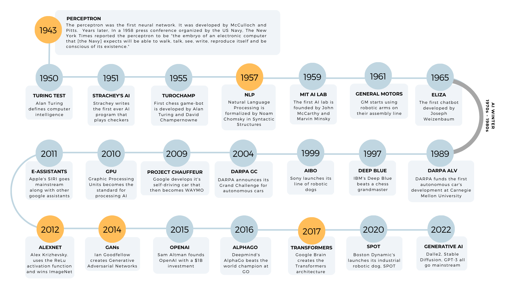 Unlike nuclear power, the development of AGI cannot be traced back to one moment in history, or one major technological advancement. This is because of how technologically it's harder to achieve, and because AGI has not been achieved yet. However, looking at the history of AI can help guide us into the future.